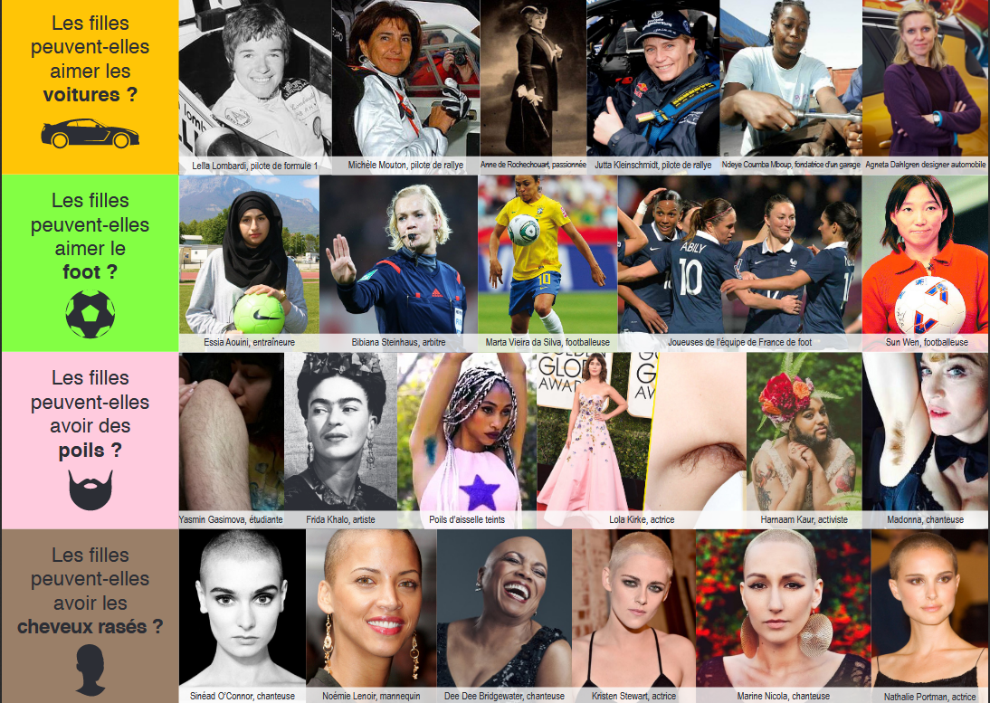 En 2017, la blogueuse Maman, rodarde ! se rend compte que son fils de 5 ans est victime de commentaires humiliants et railleurs de la part de ses camarades à l’école, d’adolescents au parc et de l’Atsem de sa classe car, tenez-nous bien, il porte du vernis. On le « traite » de fille, on se moque de lui, on lui reproche ses goûts jugés inappropriés pour un petit garçon, on le fait se sentir mal. Excédée par ces comportements sexistes — dire à un petit garçon qu’il ne peut pas porter ce qu’il veut, en l’occurence du vernis, à cause de son genre, c’est du sexisme — sa maman décide de créer des dépliants antisexistes, à destination des petits garçons et des petites filles. Parce qu’une image vaut mille mots, et que les enfants ne sont pas toujours en mesure d’argumenter face à la bêtise humaine — vous me direz, parfois les adultes non plus — ces dépliants sont une super bonne idée : déclinés en divers thèmes (vêtements, professions, émotions, identités…), ils déconstruisent les stéréotypes de genre qui ont cours dans la société. Quelques rares références sont datées car les dépliants ont été créés il y a presque 10 ans, mais cette imagerie antisexiste est toujours d’une grande actualité et d’une formidable efficacité. Maman, rodarde !, dans sa grande générosité, a non seulement créé ces dépliants mais les a mis a disposition libre et gratuite sur son site internet en format PDF : ils sont à imprimer, à découper (et pourquoi pas à plastifier pour que ça dure plus longtemps), et à glisser dans le cartable de son enfant qui pourra les dégainer à tout moment pour contrer des commentaires ou attaques sexistes, ou tout simplement pour en discuter. À glisser également entre toutes les mains des adultes qui ont encore beaucoup de choses à apprendre — et moi la première : connaissiez-vous Jeanne de Belleville, pirate par vengeance ? Saviez-vous que Ryan Gosling aimait le tricot ou encore que Malcolm X était bisexuel ? Tout un tas de savoirs à rattraper grâce à ces dépliants ludiques et nécessaires.